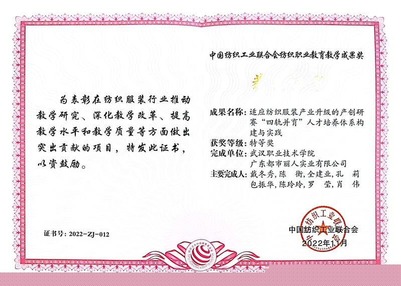 《适应纺织服装产业升级的产创研赛“四轨并育”人才培养体系构建与实践》获中国纺织工业联合会纺织职业教育教学成果奖特等奖