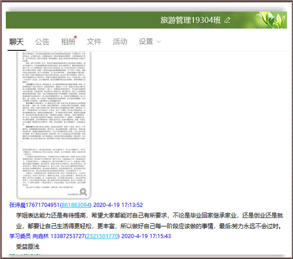 朋辈之间的交流更容易引起共鸣,张诗晨情真意切的话语在班级群里激起波澜,同学们推心置腹地交谈,或反思,或提建议,或分享疫情期间的成长感悟,气氛融洽。有同学说,“疫情之下宅在家里学习,少了老师的约束和监管,多了散漫和自由。学姐的一番话让人觉得温暖,也给我们及时敲响了警钟?!?/span>旅管19304班团支书亮相,向张诗晨学姐暖心暖肺的寄语和提振精气神的鼓励表示感谢,分析了团支部工作存在的问题,承诺“一定会不忘入学初心,砥砺奋进,努力做到更好”。