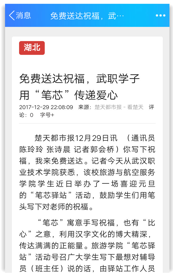 张诗晨策划的“笔芯驿站”活动被楚天都市报等媒体报道