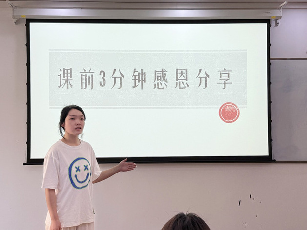 更值得关注的是“课前3分钟感恩分享”活动。各专业学生用“目标语言 + 感恩”的创意表达,让“诚信”“感恩”“责任”从枯燥的说教变成充满青春活力的“情景课堂”,实现“语言能力提升”与“价值观和品德培育”的双向赋能。