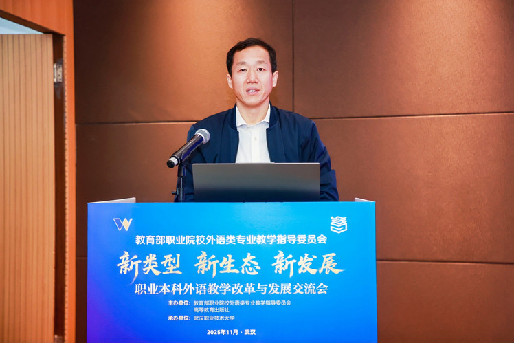 武汉职业技术大学党委副书记、校长何?;沓邪旆街禄队?,他表示职业本科外语教学改革是新时代职业教育“必答题”,学校将持续探索职业导向的公共外语教学新体系,与各界共谋高质量发展新蓝图。