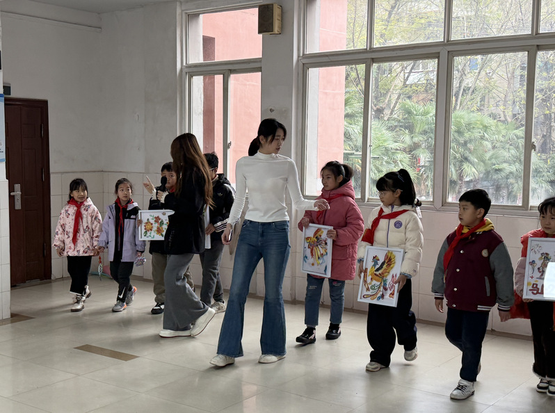 这场名为“锡三少年,衣起闪耀”的走秀,是江岸团区委、区教育局“朋辈相伴 青春同行”志愿服务项目的生动实践。时尚与传媒学院党员教师杜恒、曹欣悦带领时尚表演与传播专业学生徐美昊、李奇隆、张梓轩、胡湘格,以“朋辈辅导员”身份进校园,将专业走秀指导与小学生美术创作结合起来,打造了一堂从“创作”到“展示”的完整美育课。